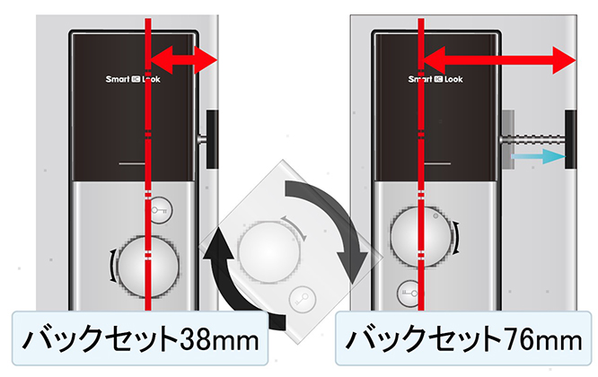 駆動部を180度回転させて取付けすることで、バックセット38~76mmまで幅広く対応。また、回転シャフトもピン差し込みタイプになっているのでドア厚32~60mmまで設置できます。